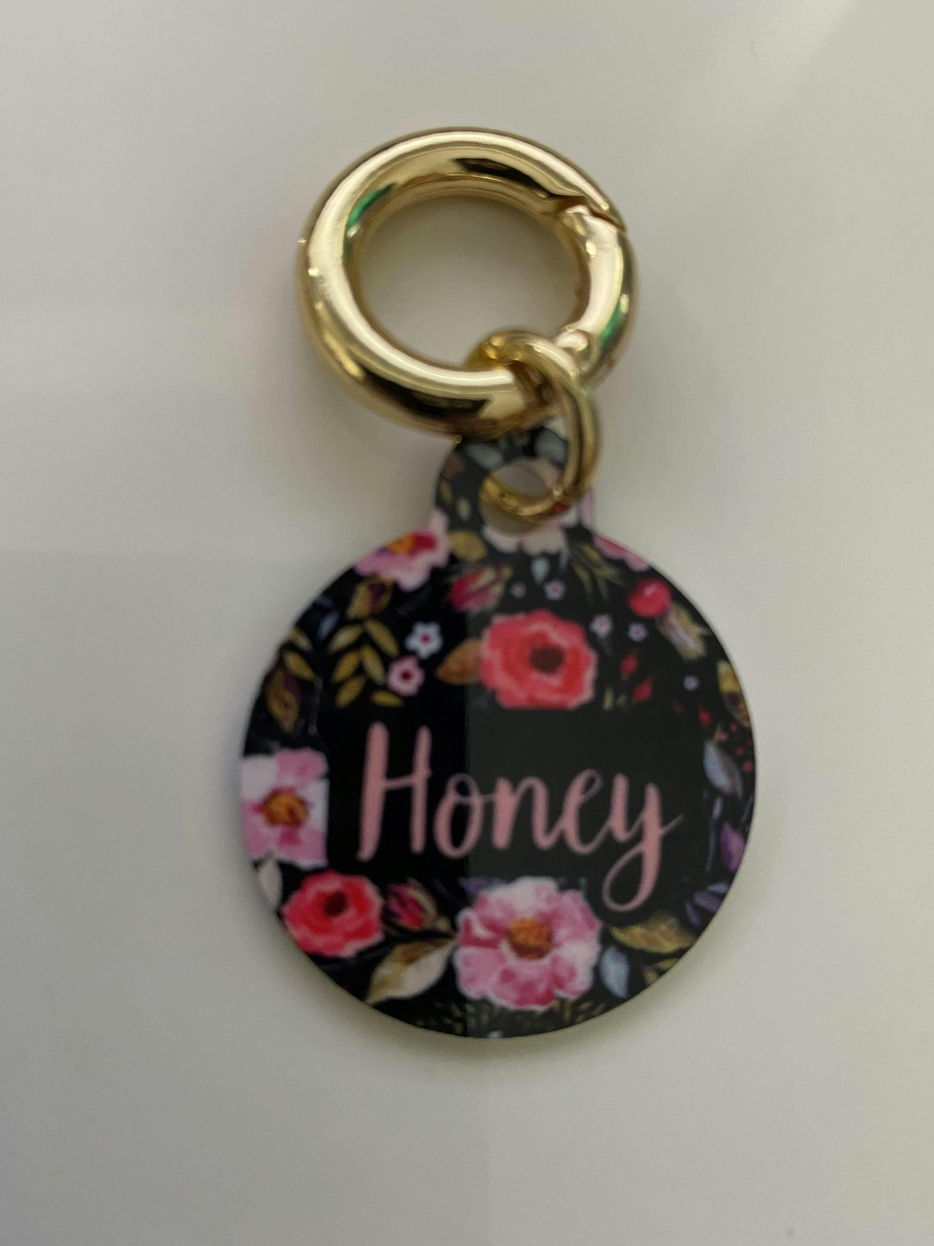 I recently purchased a black vintage flowers with rose gold eccents pet tag for my new black smoke siberian kitten.